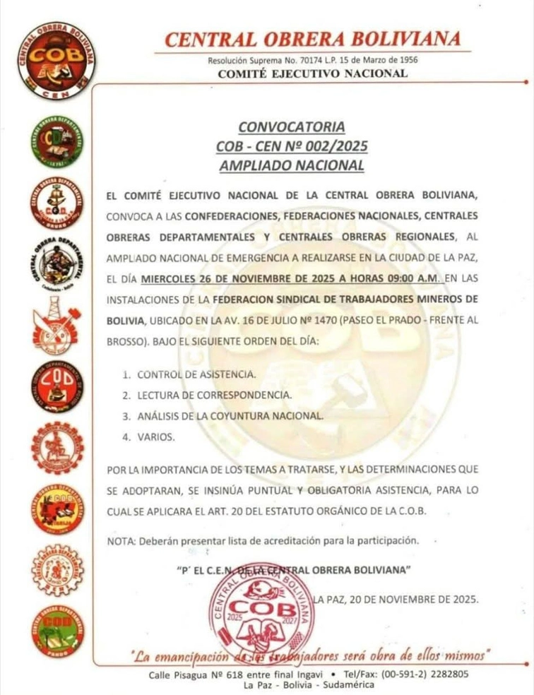 En este contexto, el dirigente anunció que la Central Obrera Boliviana (COB) convocó a un ampliado nacional «de emergencia» para este miércoles 26 de noviembre en las instalaciones de la Federación Sindical de Trabajadores Mineros de Bolivia en la ciudad de La Paz.
