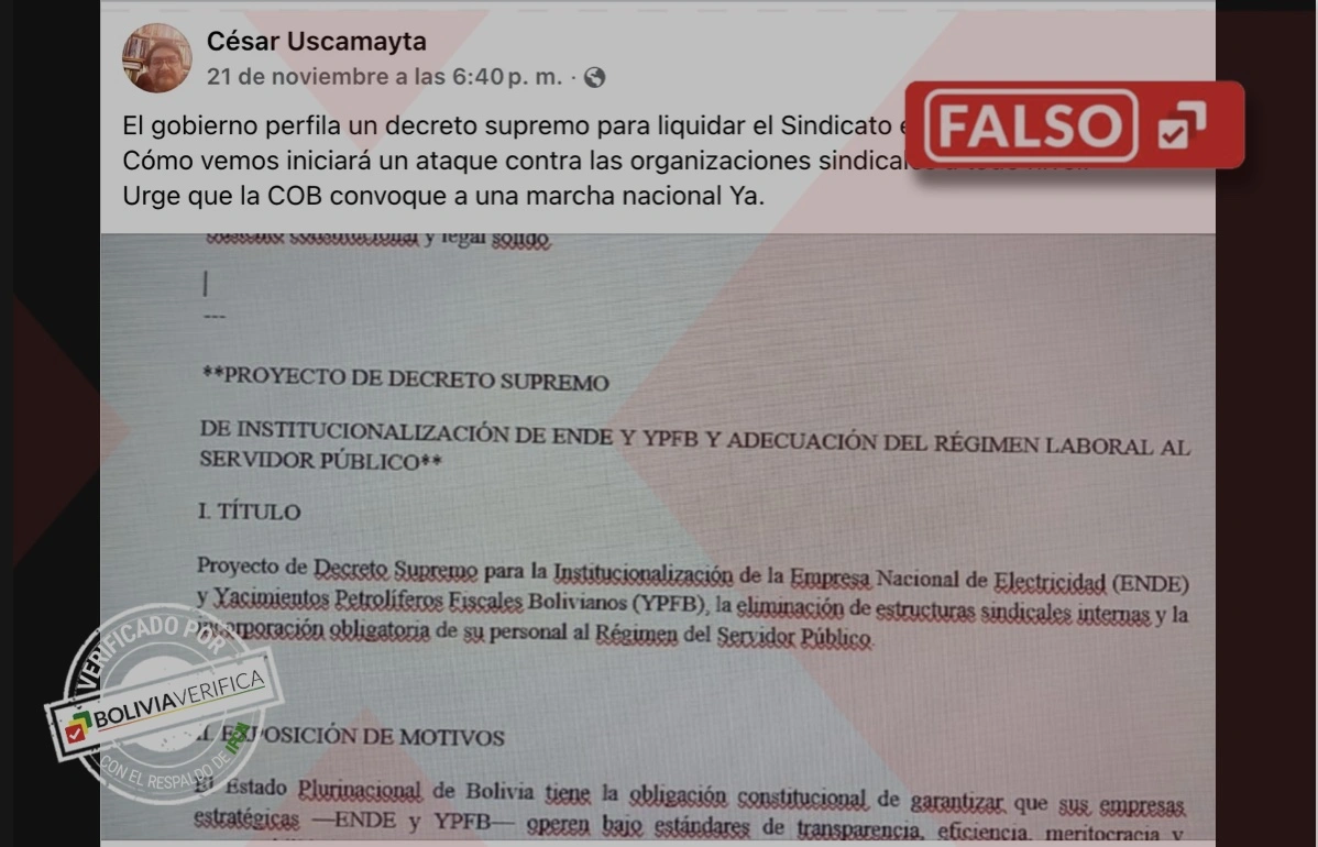Circula una publicación que alerta de un decreto supremo a nombre del presidente Rodrigo Paz Pereira para disolver los sindicatos de Yacimientos Petrolíferos Fiscales Bolivianos (YPFB) y la Empresa Nacional de Electrificación (Ende); sin embargo, este dato es incorrecto, el Gobierno nacional ha negado la existencia de alguna disposición en ese sentido.