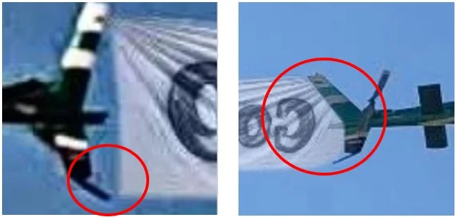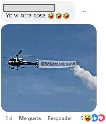- En otra versión de la imagen, el ángulo del helicóptero cambia y el cartel ya no parece colgar de un costado, sino que aparece adherido a la cola de la aeronave, lo que resulta inconsistente.
