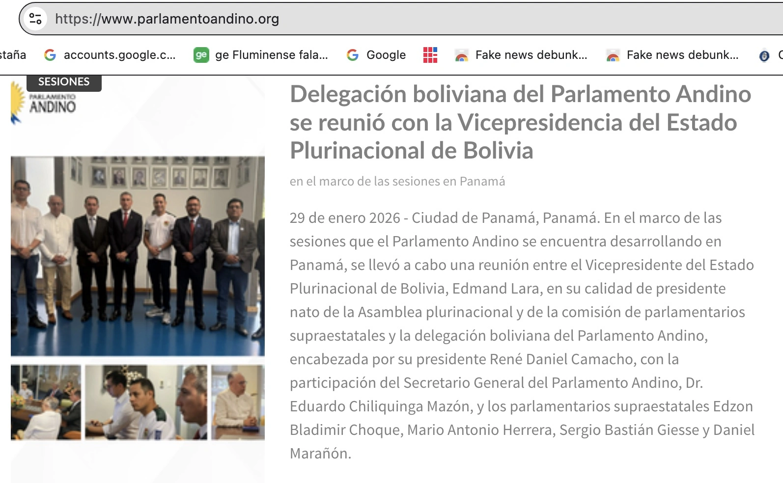 La información refiere que el 29 de enero se realizó una reunión entre el vicepresidente de Bolivia Edmand Lara en su calidad de presidente nato de la Asamblea Plurinacional y miembros de la comisión de parlamentarios supraestatales con el secretario general del Parlamento Andino Eduardo Chiliquinga Mazón.