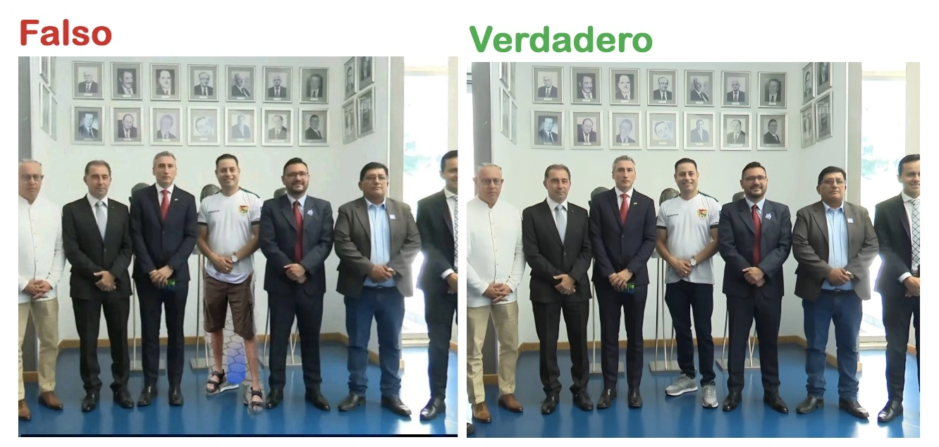 En el marco del Foro Económico Internacional en Panamá, circuló este fin de semana una imagen del vicepresidente Edmand Lara Montaño en un encuentro diplomático junto a directivos del Parlamento Andino, donde él viste un pantalón corto y sandalias; sin embargo, el contenido es falso. La imagen fue modificada con herramientas de inteligencia artificial (IA).