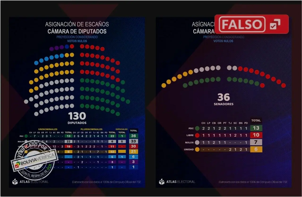 Desde la cuenta Atlas Electoral, en Facebook, se difunden dos imágenes que muestran la distribución de escaños en el Legislativo para la gestión 2025-2030. Sin embargo, este contenido es falsa porque toma en cuenta los votos nulos y blancos, que para le legislación electoral boliviana no son válidos.