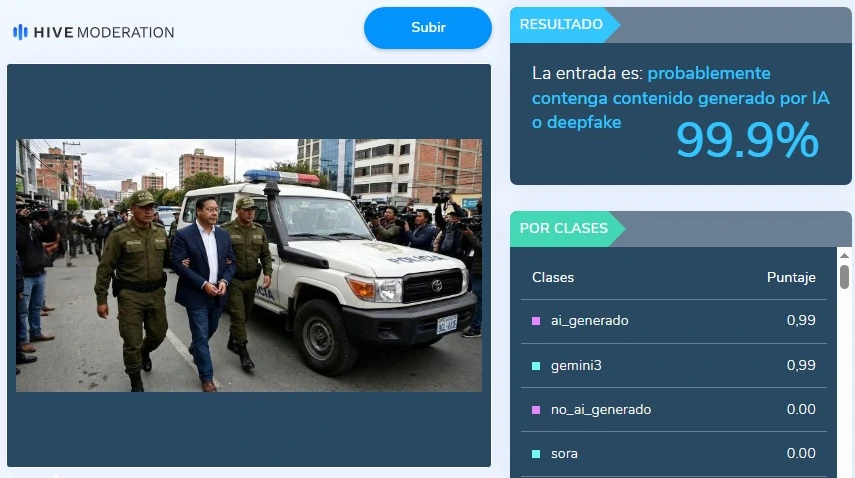 El archivo fue sometido a la herramienta de detección de IA Hive Moderation, la cual arrojó un resultado de 99.9% de probabilidad de que la imagen haya sido generada mediante inteligencia artificial. Esta evidencia corrobora, con un alto grado de certeza, la manipulación del contenido.