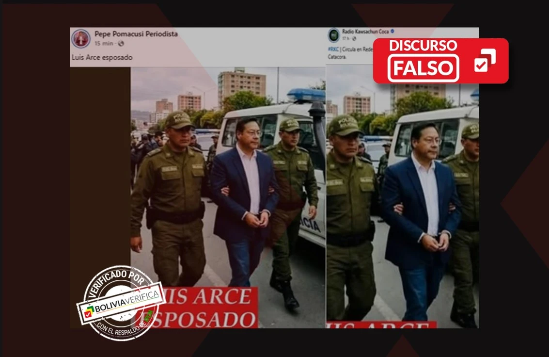 En diversas publicaciones de Facebook (1, 2 y 3) circularon imágenes falsas que muestran al expresidente y exministro Luis Arce Catacora esposado y escoltado por dos policías. Si bien el mandamiento de aprehensión contra Arce es real y fue ejecutado por la Policía, la fotografía específica difundida en las redes sociales es una manipulación creada con inteligencia artificial.