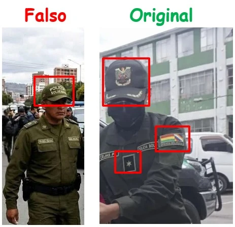 • El color de la indumentaria policial es inconsistente y la imagen falsa omite la presencia de elementos esenciales en el uniforme real, como la bandera tricolor y la whipala.