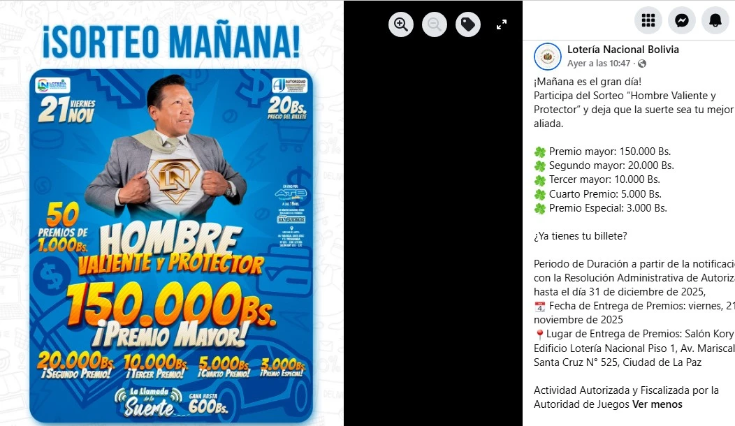 La fotografía utilizada fue tomada de la página oficial de la Lotería corresponde a la campaña «Hombre valiente y protector«, promocionada para un sorteo programado el 21 de noviembre de 2025.
