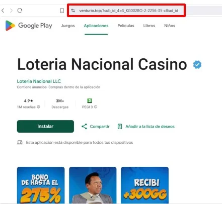 Al hacer clic en el botón «instalar», el usuario es dirigido a un primer enlace y a pesar de que la página intenta imitar a Google Play, el link no pertenece a ninguna tienda oficial de aplicaciones.