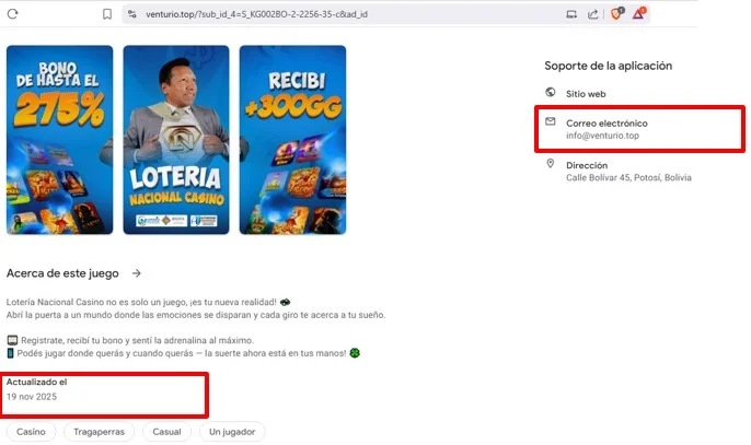 La supuesta aplicación asegura haber sido actualizada el 19 de octubre y tiene como correo de contacto: info@venturio.top, nada relacionado a la Lotería Nacional.