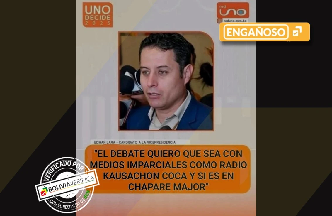 En Facebook circula una imagen con una frase atribuida a Edmand Lara, candidato a la vicepresidencia por el Partido Demócrata Cristiano (PDC), en la que solicita que el debate electoral se realice en medios imparciales y menciona como ejemplo a Radio Kawsachun Coca (RKC). El contenido es engañoso: si bien Lara pidió que el debate se realice en un “terreno neutral”, en ningún momento hizo referencia a esa emisora.