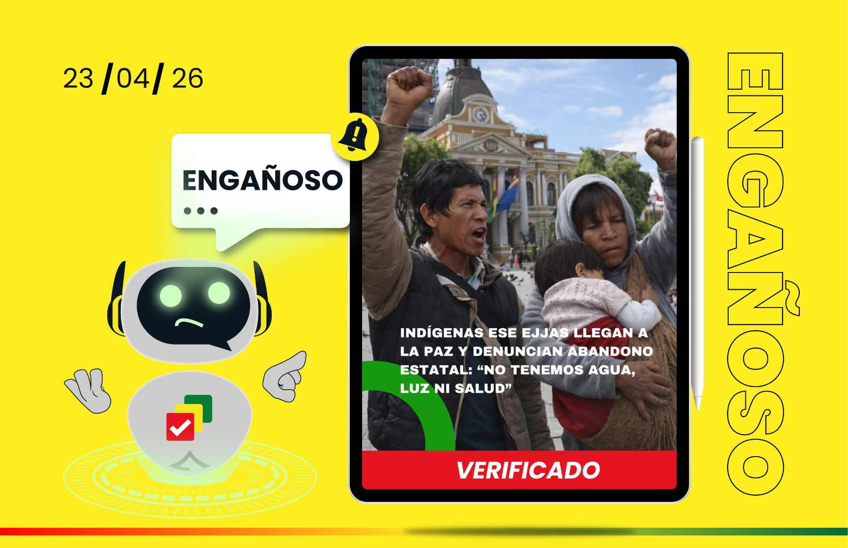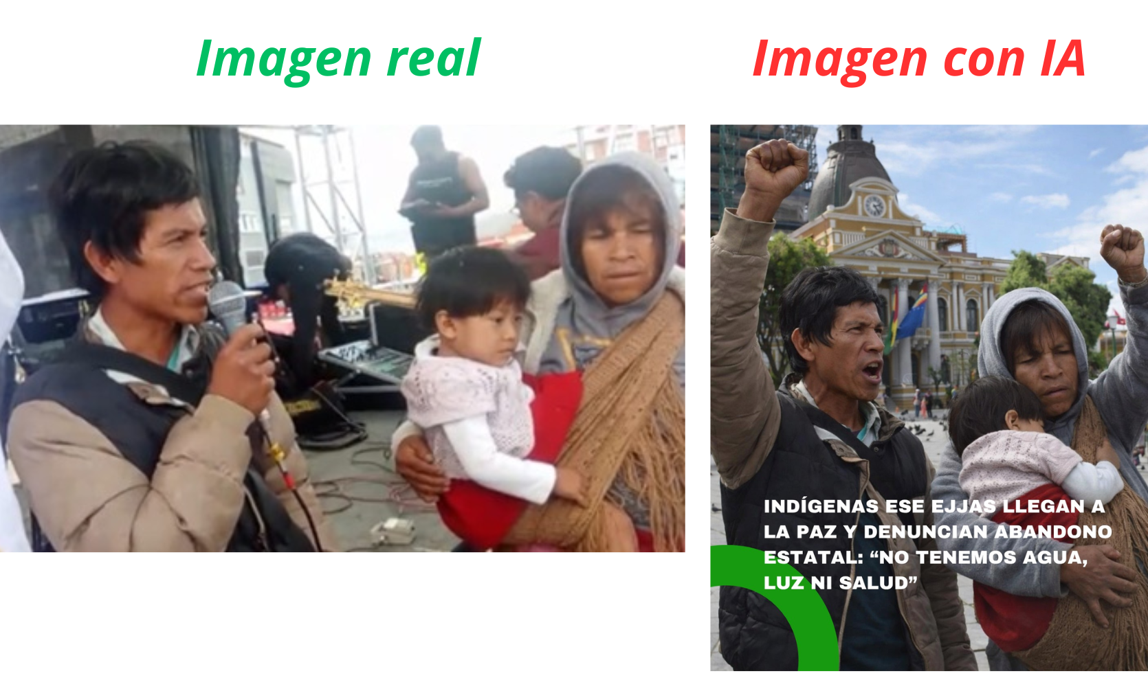 Aunque la visita de indígenas Ese Ejja a La Paz es un hecho real y documentado, la imagen difundida en redes fue generada con IA y, según la periodista Jimena Mercado, puede inducir a interpretaciones erróneas. La organización que la difundió sostiene que es un recurso gráfico que no busca distorsionar la realidad ni la demanda.