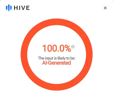 La imagen fue analizada con la herramienta de detección de IA Hive Moderation, que arrojó un 100% de probabilidad de haber sido generada artificialmente.