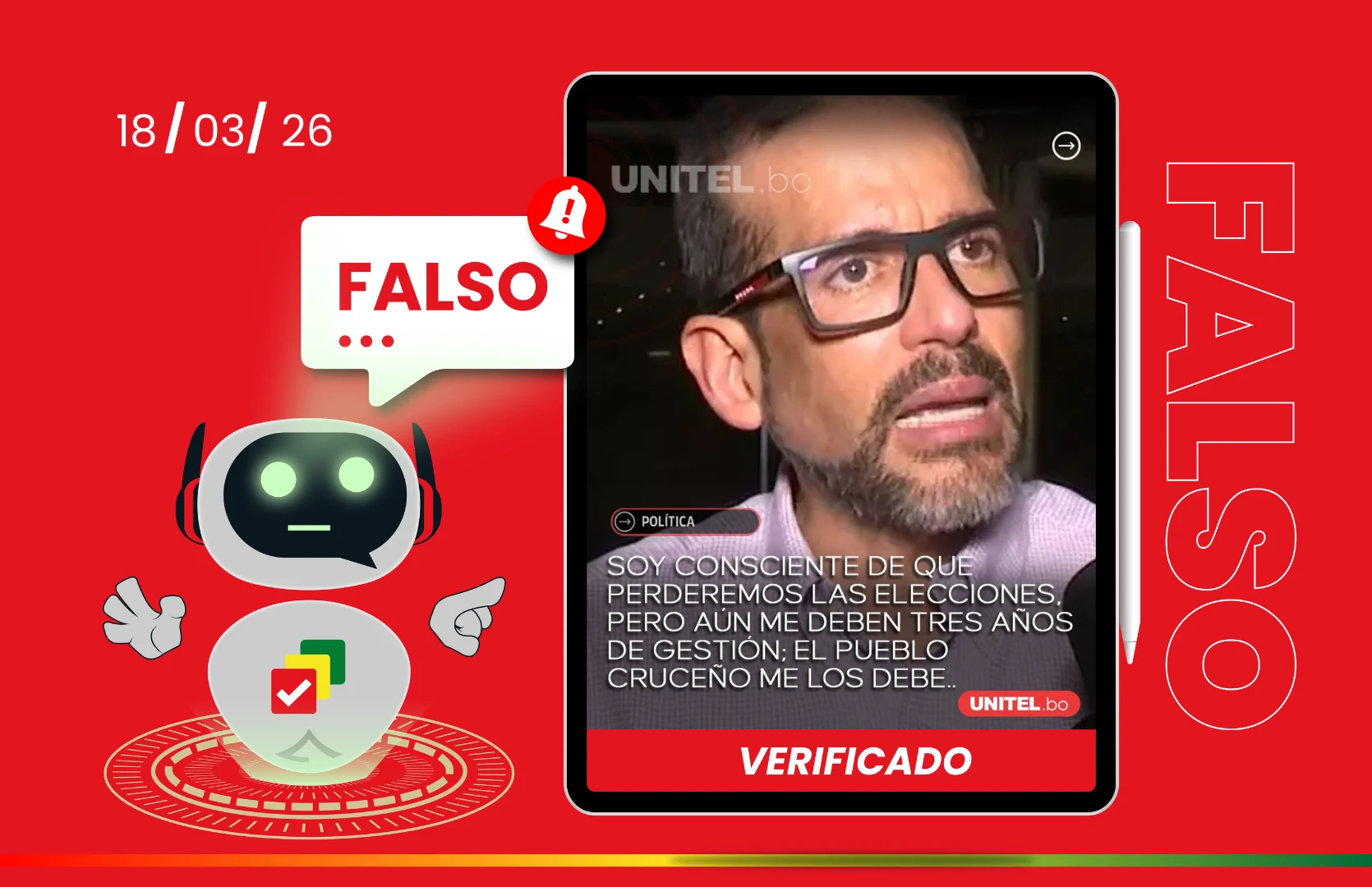 La desinformación circula en un contexto electoral marcado por encuestas falsas y declaraciones inventadas. El próximo 22 de marzo se realizarán las elecciones subnacionales en Bolivia, en las que la población elegirá gobernadores, asambleístas departamentales, alcaldes, concejales y representantes regionales para el periodo 2026-2031. Luis Fernando Camacho participa como candidato a la gobernación de Santa Cruz, buscando su reelección.