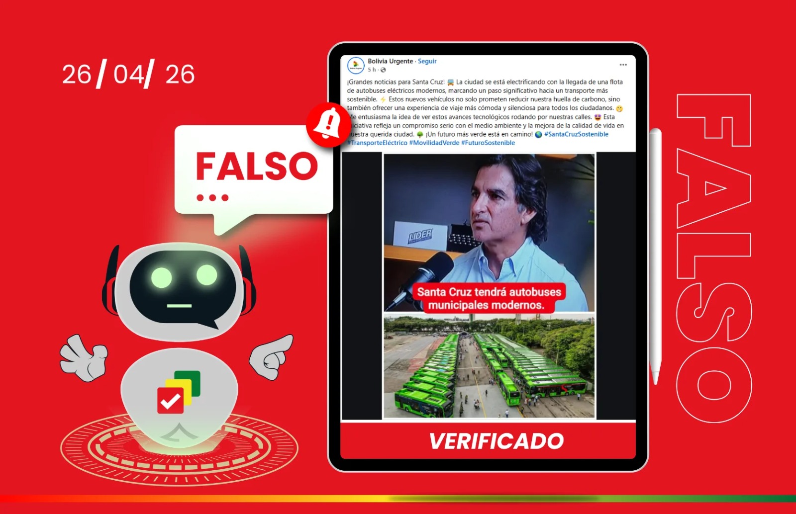 Una publicación difundida en Facebook por la página “Bolivia Urgente” indica que Santa Cruz ya cuenta con una flota de buses eléctricos municipales. El contenido generó alta interacción y fue interpretado por una mayoría de los usuarios como un «avance concreto» vinculado al alcalde electo Manuel “Mamen” Saavedra; sin embargo, el contenido es falso.