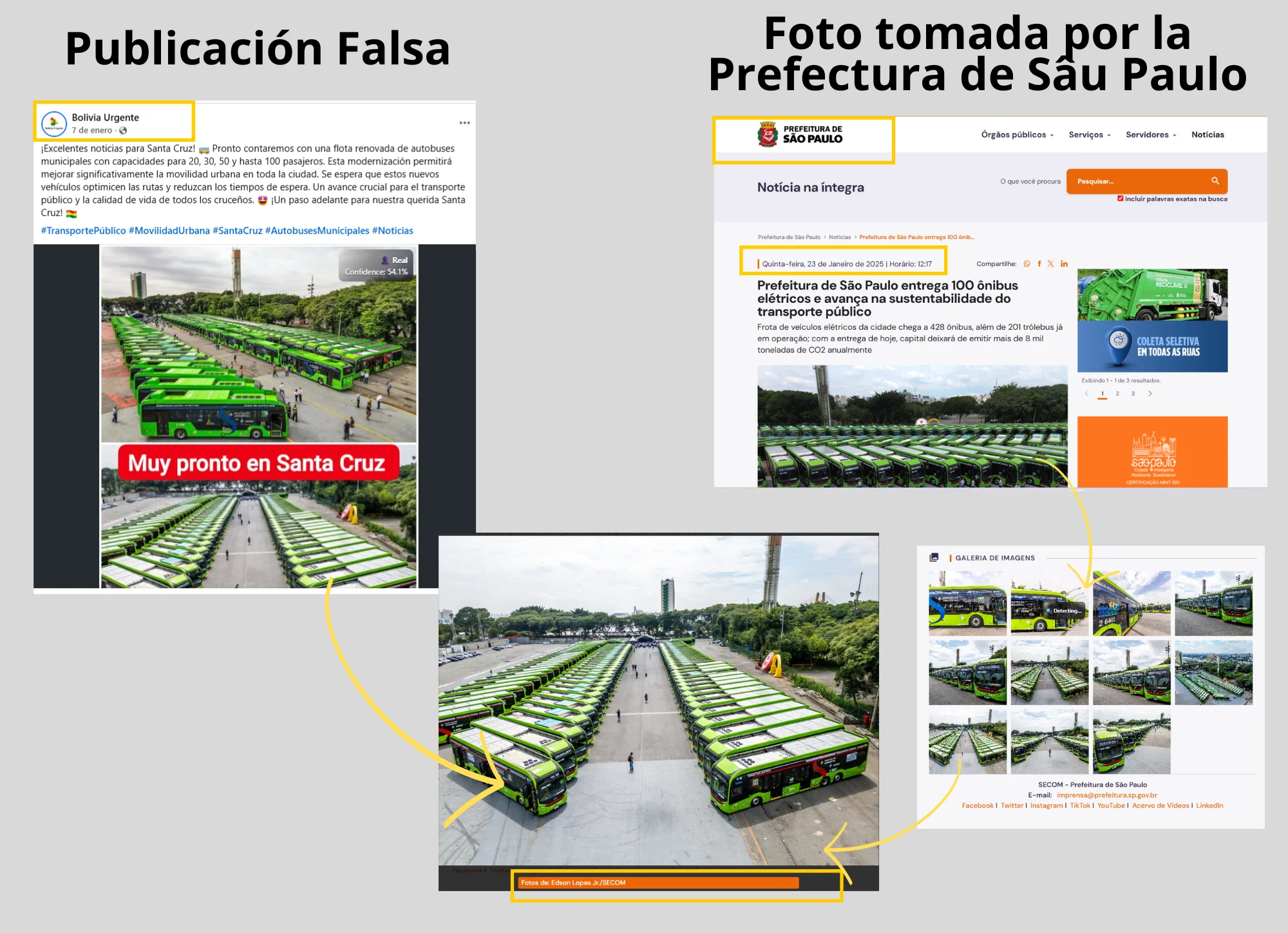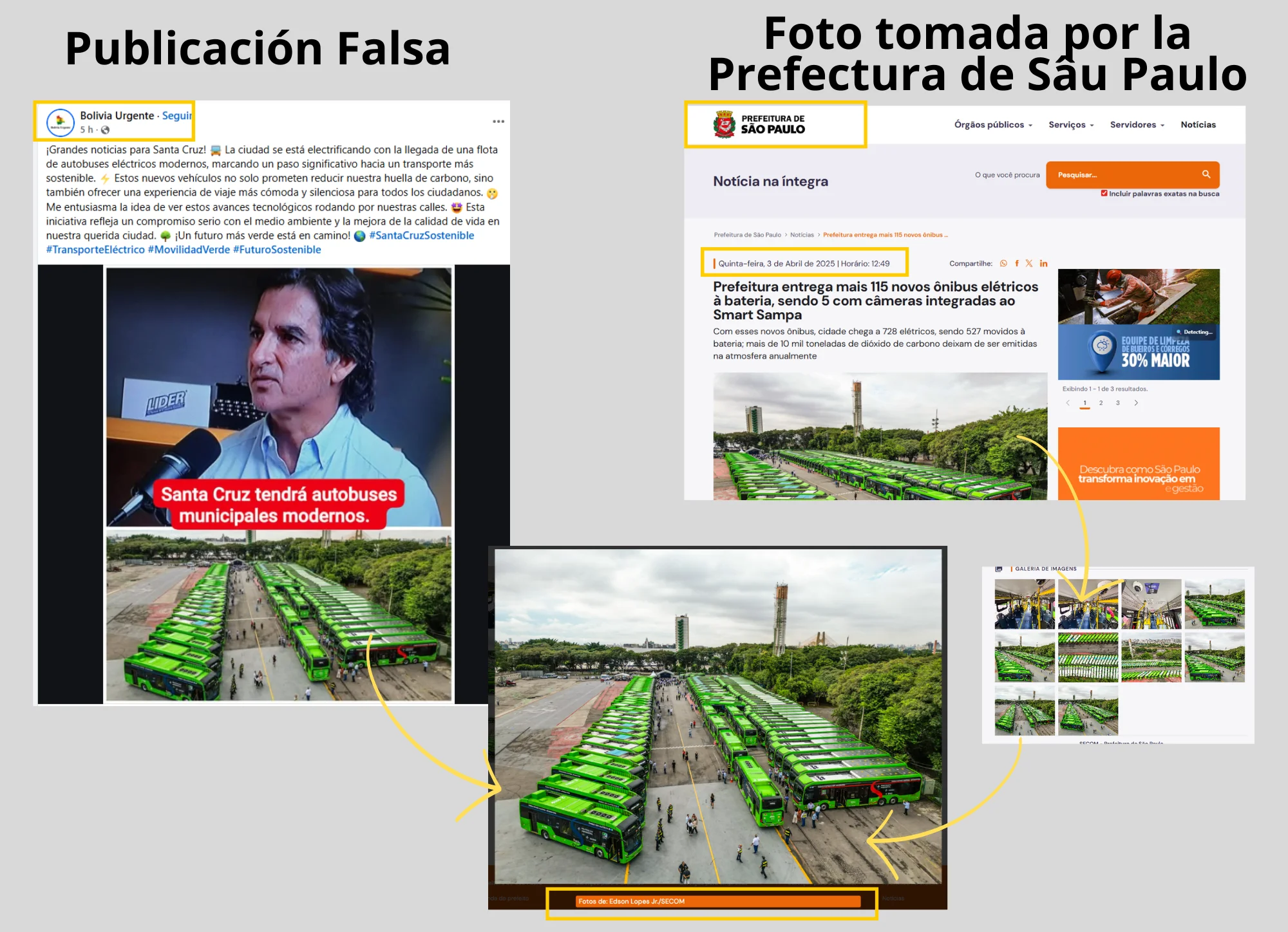 Además, se identificó que la página “Bolivia Urgente” ya había utilizado imágenes similares en otra publicación (aquí). Una de ellas corresponde a un evento realizado el 23 de enero de 2025 en São Paulo (aquí), donde se entregaron 100 buses eléctricos, lo que evidencia un uso reiterado de imágenes fuera de contexto.