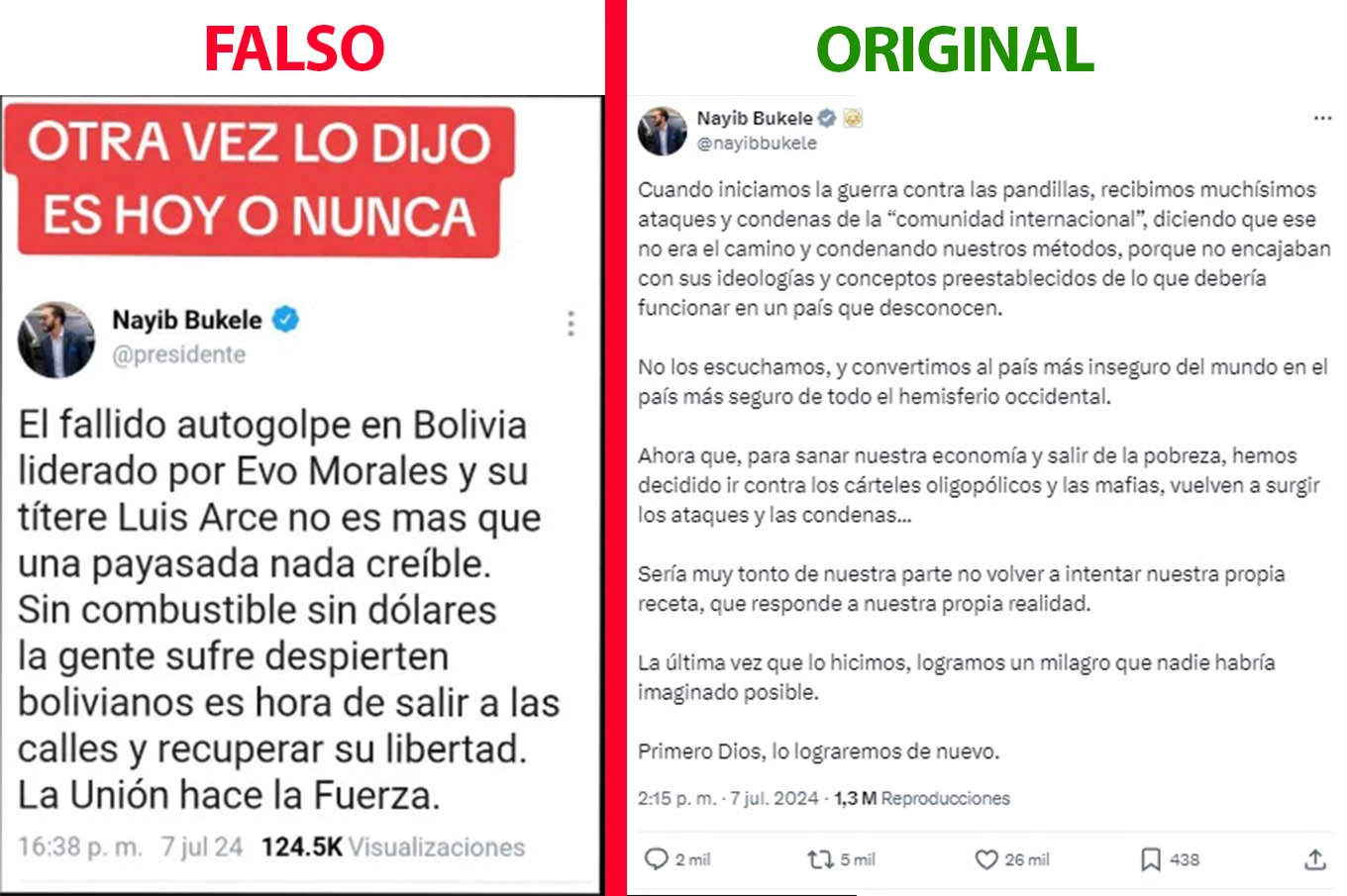 Bajo este contexto circula el contenido en cuestión. Desde los hechos ocurridos en Bolivia el 26 de junio se difundieron diferentes publicaciones atribuidos a personalidades políticas, una de ellas Bukele.