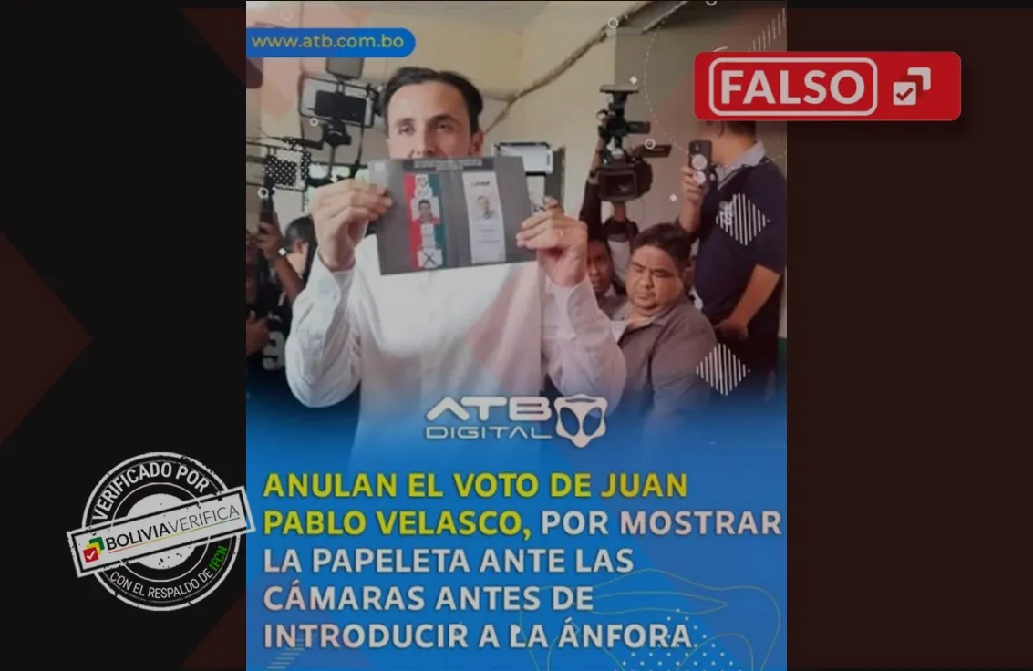 Mediante la cuenta @bolivia_al_instante en TikTok se compartió una fotografía con la línea gráfica ATB Digital, en la que muestra al candidato vicepresidencial de Alianza Libre, Juan Pablo Velasco mostrando su papeleta de votación marcada a favor del binomio del Partido Demócrata Cristiano (PDC). Según la descripción, esta acción habría anulado su voto. No obstante, tanto la imagen como el texto son falsas.