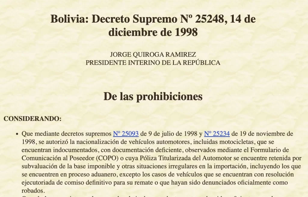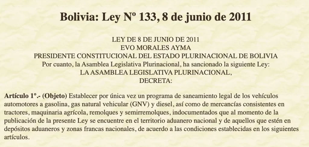 Una revisión histórica de las políticas para la regularización de los vehículos indocumentados en Bolivia evidencia que, dependiendo del contexto y el gobierno de turno, se emitieron decretos y aprobaron leyes con este fin.