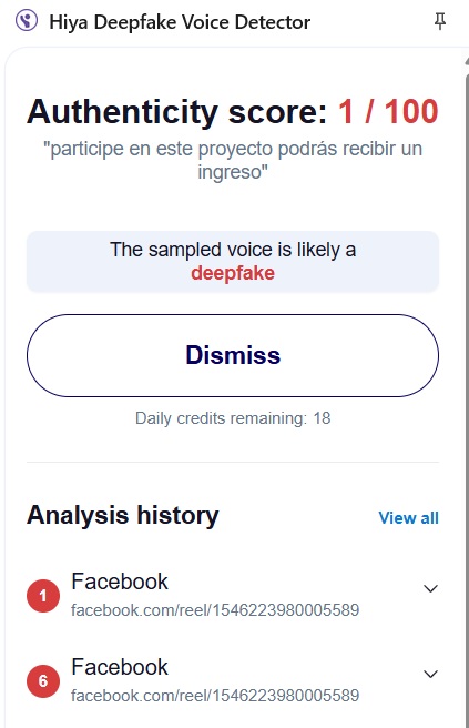 Pero este audio se puso a prueba y la herramienta Hiya Deepfake Voice Detector indica que solo tiene el 1/100 de autenticidad, confirmando así que es un deepfake.