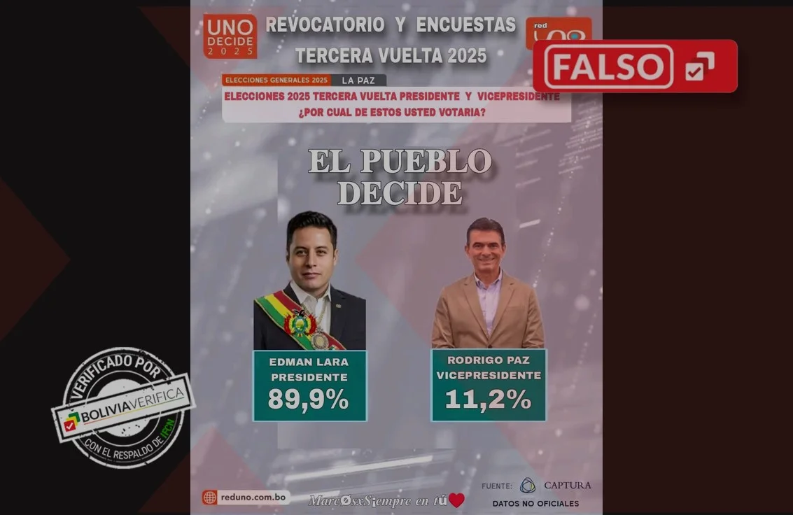 Mediante la página Studios Red Bolivia, en Facebook, se compartió una imagen con el logotipo de Red Uno en la presenta el resultado de una encuesta titulada «¿Por cuál de ustedes votaría?», y Edmand Lara figura como presidente con un 89,9% y Rodrigo Paz como vicepresidente con 11,2%. Empero, este contenido es falso.