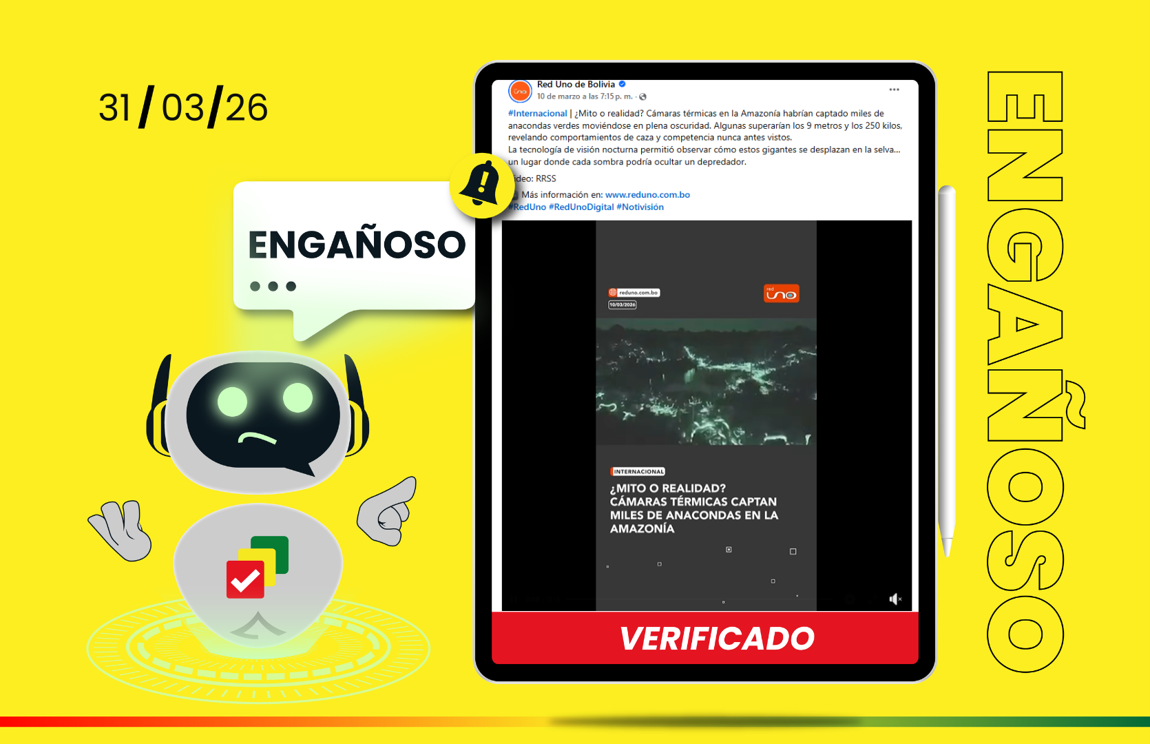 Una seguidora de Bolivia Verifica alertó a nuestro medio de que la Red Uno publicó un video en el que anuncia que una cámara infrarroja filmó a un montón de anacondas en la Amazonía, pero esto es un discurso engañoso porque el video no tiene sustento científico y fue creado con inteligencia artificial.