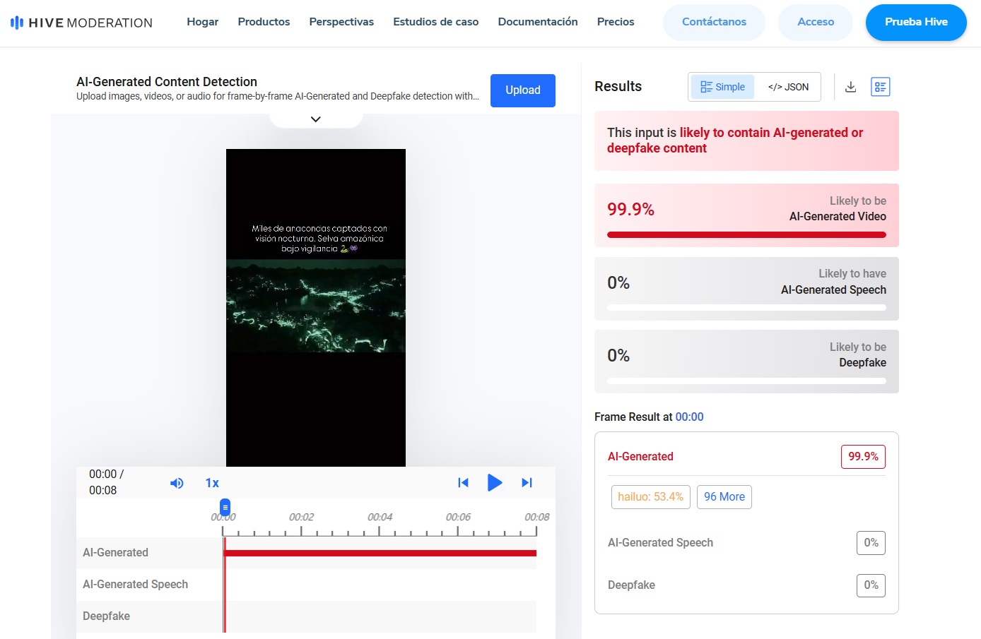 Por esa razón, Bolivia Verifica sometió el video a un análisis con la herramienta Hive Moderation. Esta señala que tiene el 99.9% de probabilidad de ser un material generado con IA.