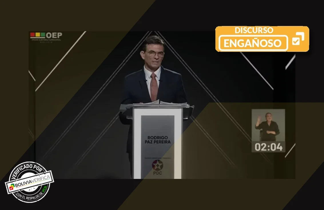 En el último debate presidencial, el candidato por el Partido Demócrata Cristiano (PDC) Rodrigo Paz dio un dato correcto y otro incorrecto sobre el número de médicos en el país y la región. Por un lado, dijo que Bolivia solo tiene cinco médicos por cada 10.000 pacientes, lo cual es falso. Y por otro, afirmó que la media en Latinoamérica es de 20 médicos por cada 10.000 habitantes, lo que sí es verdadero. Por tanto, su discurso se considera engañoso.