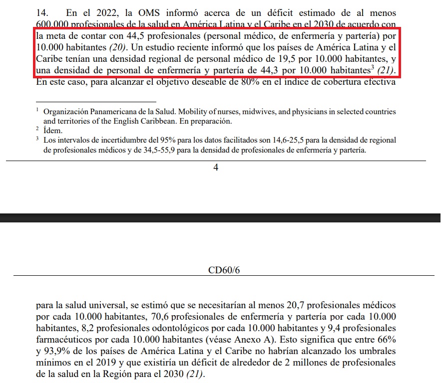 En su documento «Políticas sobre el personal de salud 2030: fortalecimiento de los recursos humanos para la salud a fin de lograr sistemas de salud resilientes» (publicado en 2023), se señala que los países de América Latina y el Caribe tienen una densidad promedio de 19,5 médicos por cada 10.000 habitantes, y 44,3 profesionales de enfermería y partería en el mismo rango poblacional.
