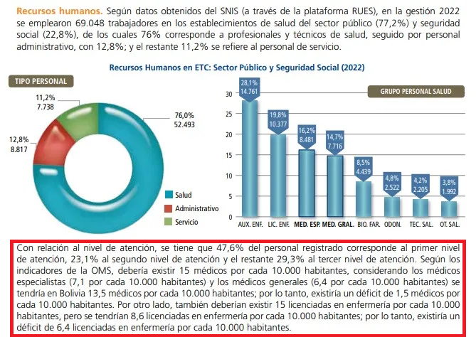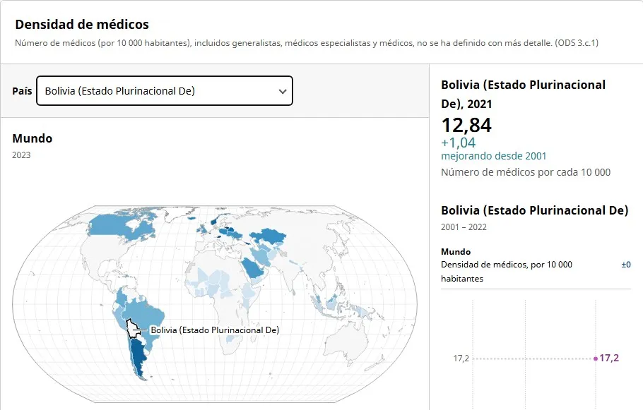 Con datos de 2021 y 2022, la Organización Mundial de la Salud (OMS) reportó que Bolivia tiene 12,8 médicos por cada 10.000 habitantes, cifra superior a la mencionada por Paz.