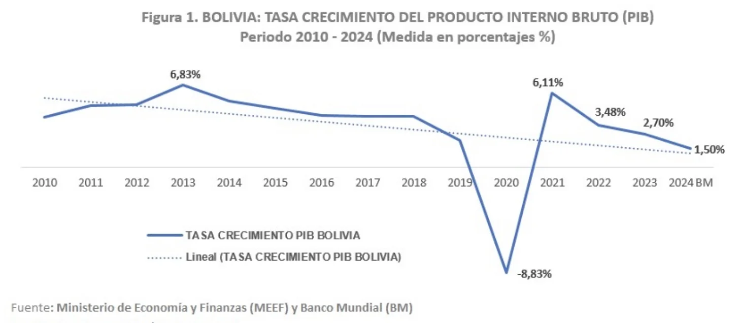 Algunos indicadores del declive gradual de la economía boliviana son la falta de impulso a la producción y a la diversificación productiva, la caída de las exportaciones, la caída de las reservas internacionales y una crisis de la balanza de pagos.