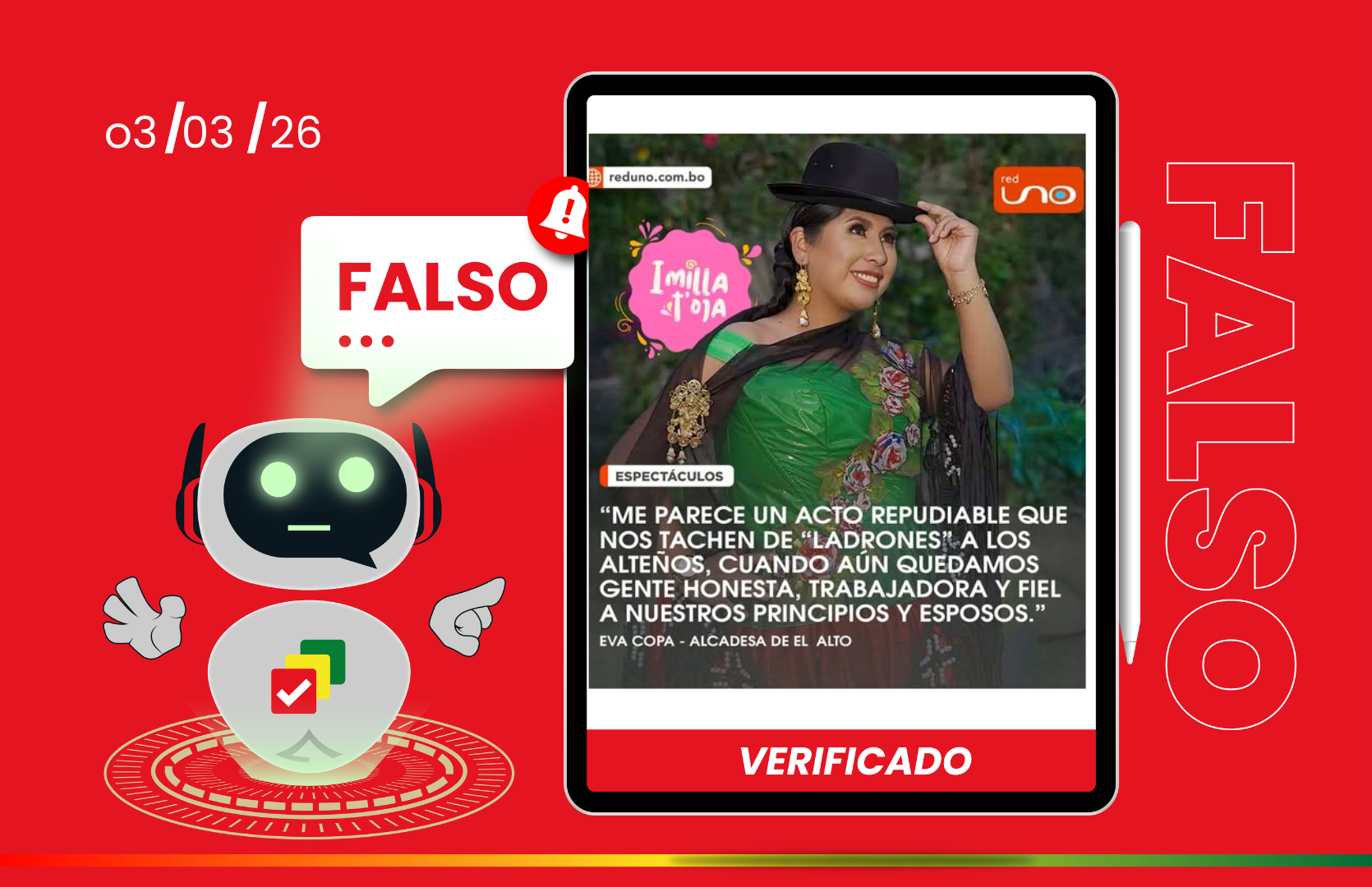 Una imagen publicada en Facebook por la página Imilla t’oja presenta una declaración de la alcaldesa de El Alto, Eva Copa, acompañada del logotipo de Red Uno, como si se tratara de una publicación informativa del medio. Sin embargo, es falsa.