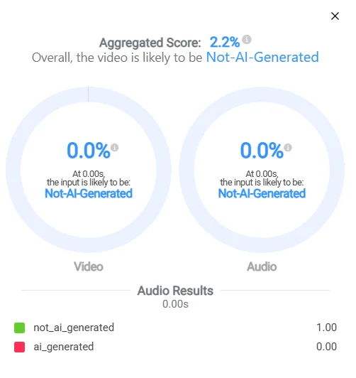 Bolivia Verifica realizó además un análisis de detección de inteligencia artificial para descartar que se trate de un video generado artificialmente. Herramientas como Hive Moderation indican que el material presenta solo un 2,2% de probabilidad de haber sido generado por IA, lo que permite concluir que se trata de un video auténtico, pero no actual.