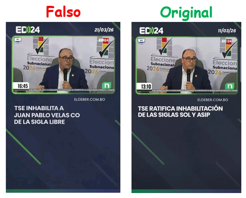 La pieza viral modifica el titular y la fecha de un video original de El Deber para difundir una inhabilitación inexistente de Juan Pablo Velasco.