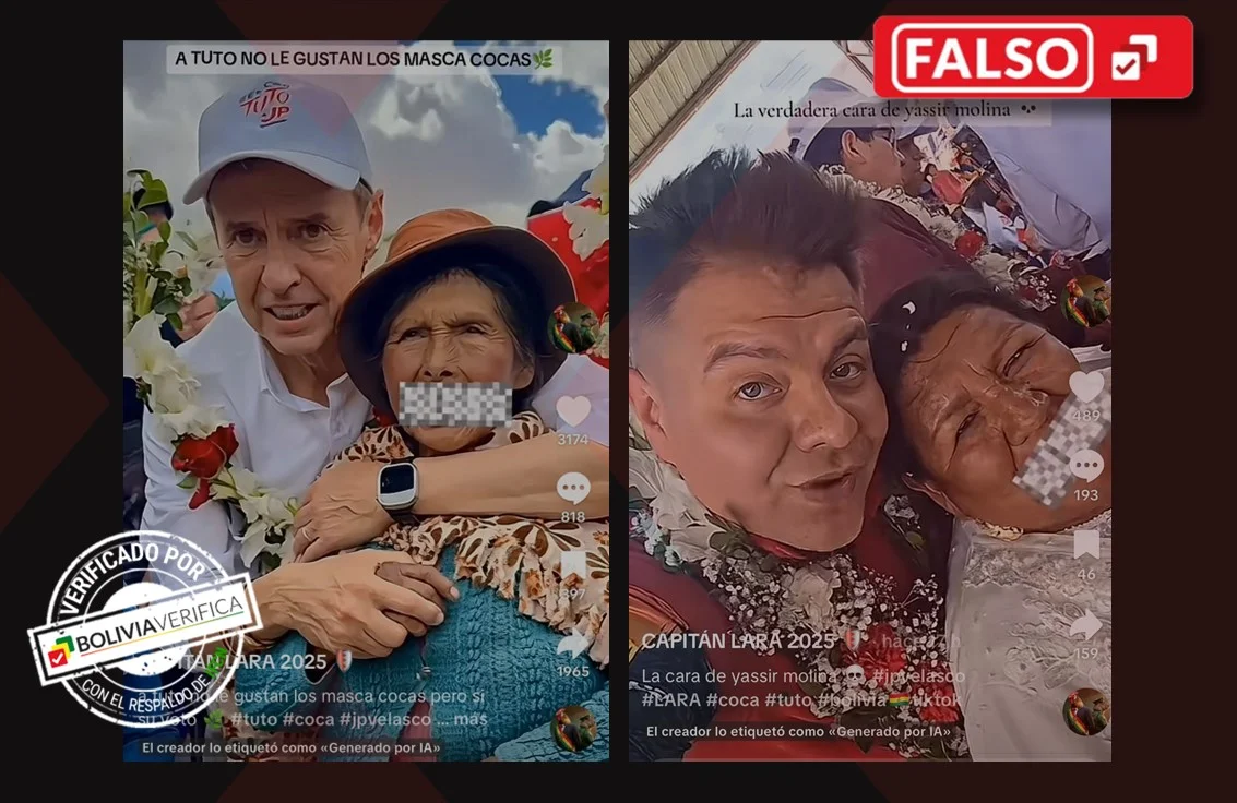En TikTok (1 y 2) y en Facebook (1) circulan dos videos en donde se observa al candidato a la presidencia Jorque Tuto Quiroga (Alianza Libre) y al exintegrante de la Resistencia Juvenil Cochala (RJC) Yassir Molina a quienes se les escucha expresarse de manera discriminatoria. No obstante, estos clips son falsos, ya que fueron generados con herramientas de inteligencia artificial (IA) a través del uso de fotografías reales y crear este material.