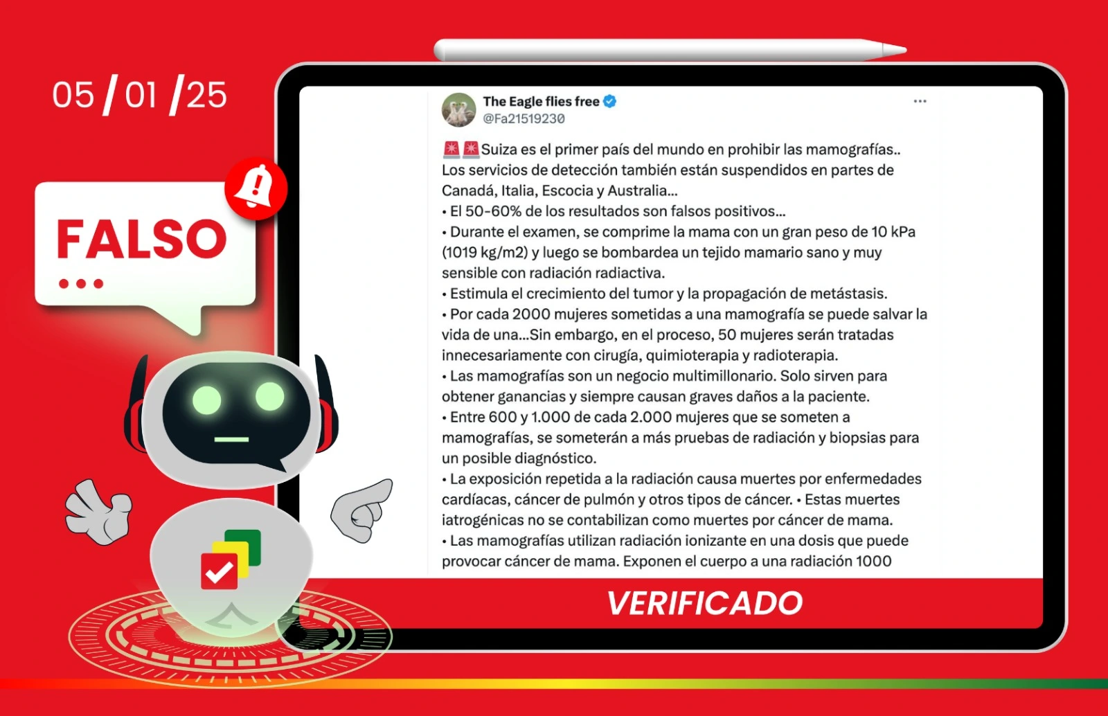 Las afirmaciones virales que circulan sobre la supuesta prohibición de las mamografías en Suiza y la suspensión de los programas de cribado en varios países son completamente falsas. La evidencia oficial demuestra que estos programas siguen activos y recomendados, y que continúan siendo una herramienta esencial para la detección temprana del cáncer de mama. Aunque pueden producirse falsos positivos, estos deben interpretarse como una medida de precaución y no como un diagnóstico. Asimismo, los expertos coinciden en que la radiación empleada es mínima y que los beneficios del cribado superan con creces sus riesgos.