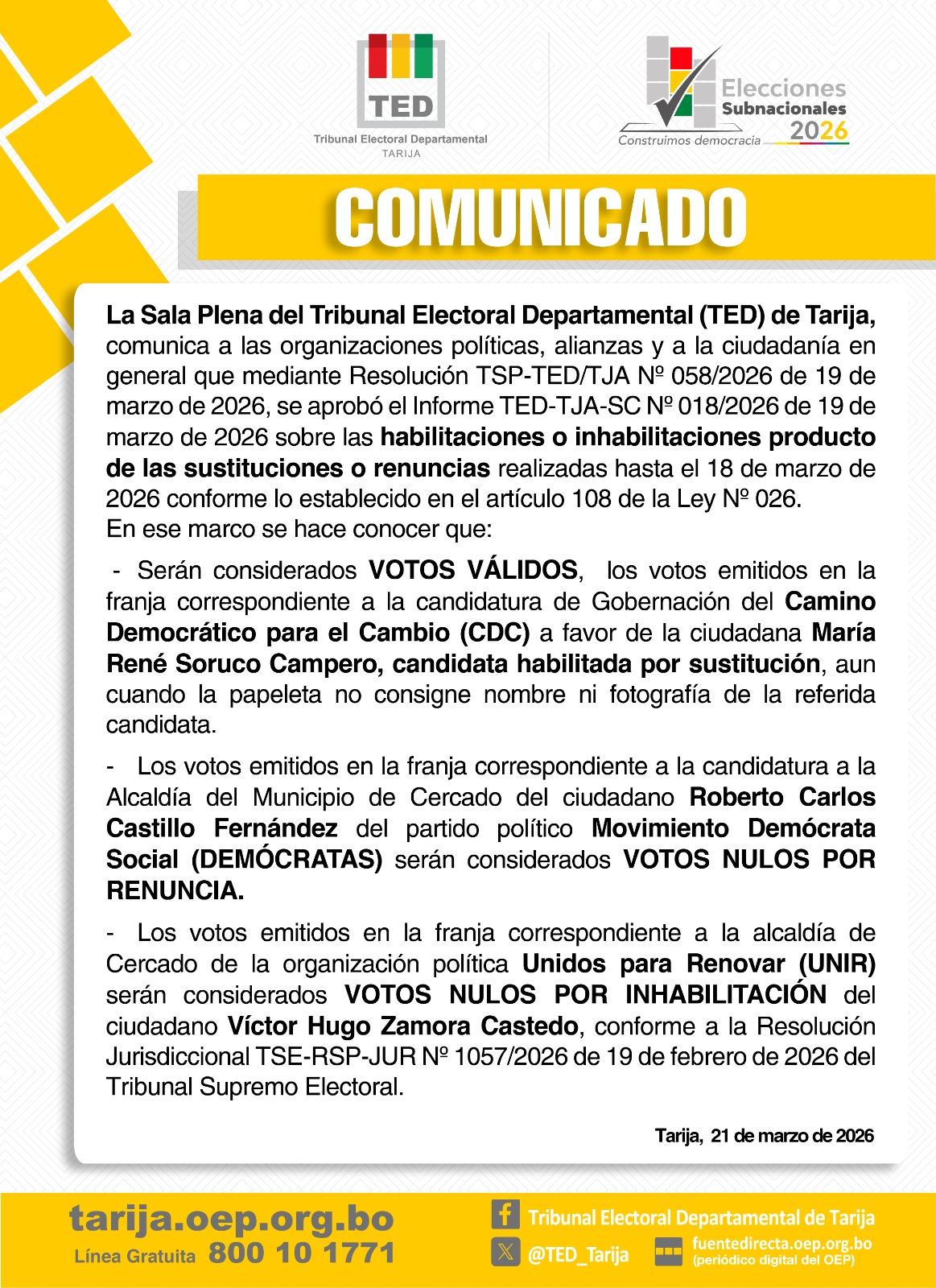 El Tribunal Electoral Departamental de Tarija (TED) aclaró a nuestra redacción que la citada publicación es falsa. El TED mediante un comunicado publicado este sábado 21 de marzo informó que serán considerados “votos válidos” los que sean emitidos en la franja correspondiente a la candidatura de Gobernación de Camino Democrático al Cambio a favor de María René Soruco Campero, quien fue habilitada por sustitución. “Aun cuando la papeleta no consigne nombre ni fotografía de la referida candidata”.