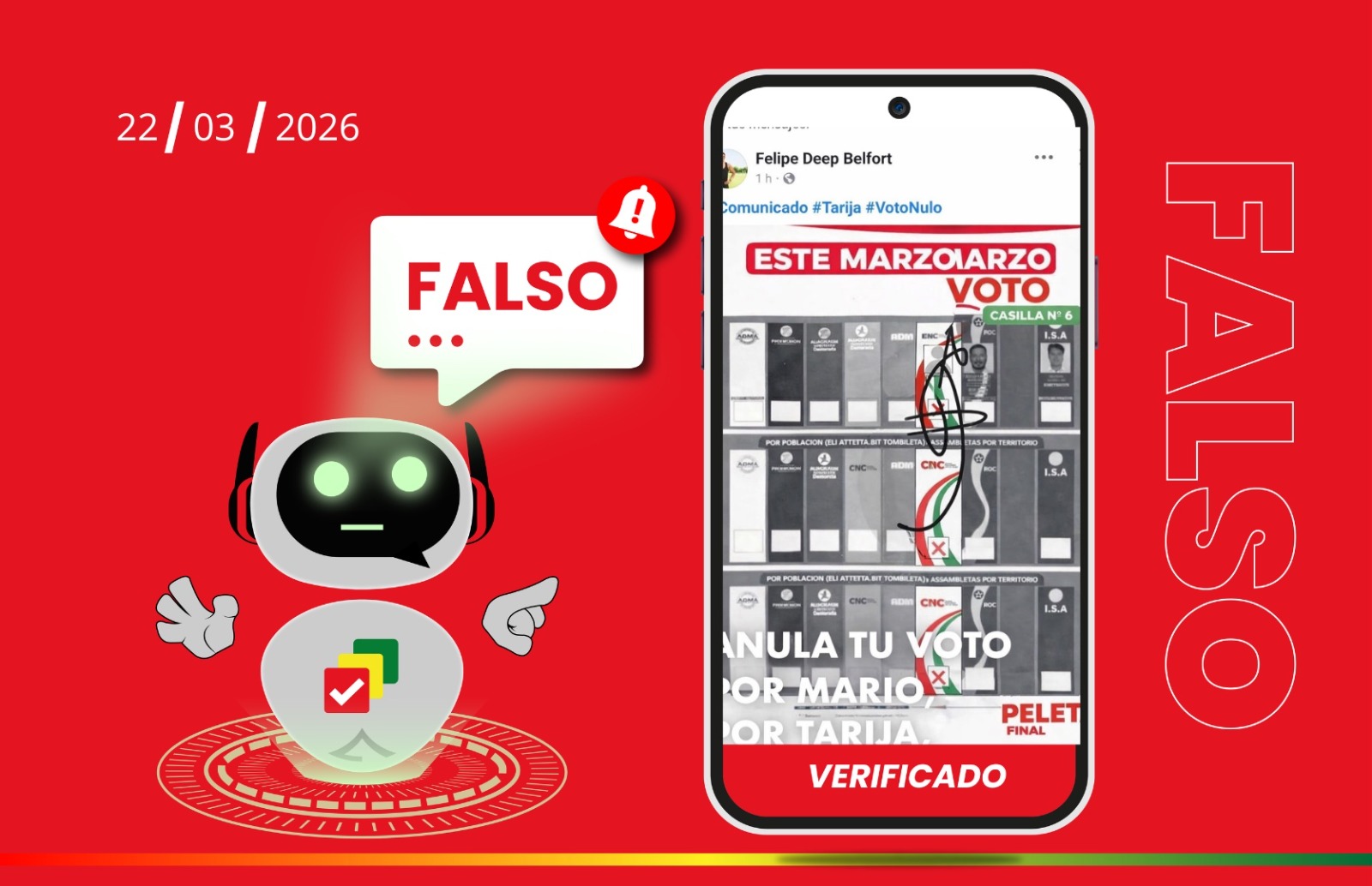 La cuenta de nombre Felipe Deep Belfort que difundió este fin de semana el bulo del voto nulo fue eliminada. El contenido fue difundido en grupos de Facebook. La imagen fue publicada en grupos como: Trabajos Tarija, Ofertas y anuncios-Tarija, Cachi Noticias, Se vende de todo…Tarija, Compra y Venta Tarija 2026, Los Cachis Tarija, Ofertas Inmobiliarias e Inmobiliaria Tarija Marketplace.