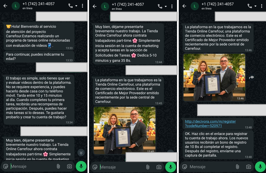 Además, una búsqueda permitió establecer que Carrefour es una empresa multinacional de distribución de alimentos, con presencia en distintos países, pero no ofrece programas de pago por ver videos ni utiliza WhatsApp para reclutar personal de esta manera.