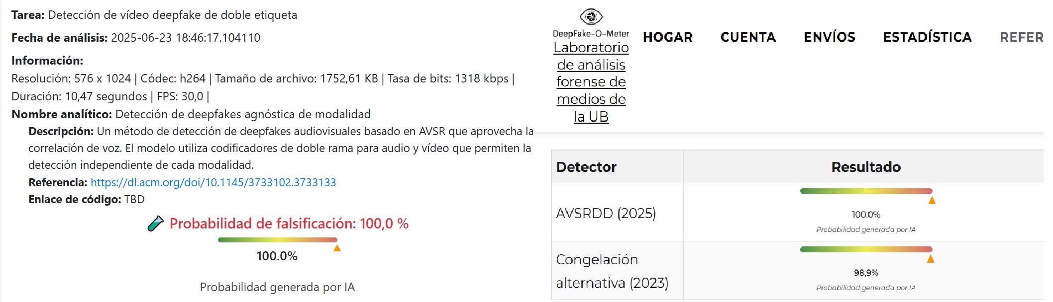 Bolivia Verifica sometió este material a una revisión con la herramienta Deepfake-o-meter, una plataforma en línea que detecta videos, imágenes y audios falsos creados mediante técnicas de inteligencia artificial. El resultado arrojó un 100% de probabilidad de falsificación y de probabilidad que fue generado por IA.