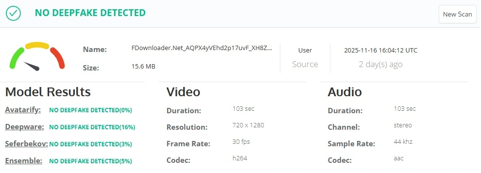 En primera instancia, se sometió el video a un análisis con herramientas de detección; para las imágenes y el audio, los resultados que arrojaron son que no se detectó el uso de IA.
