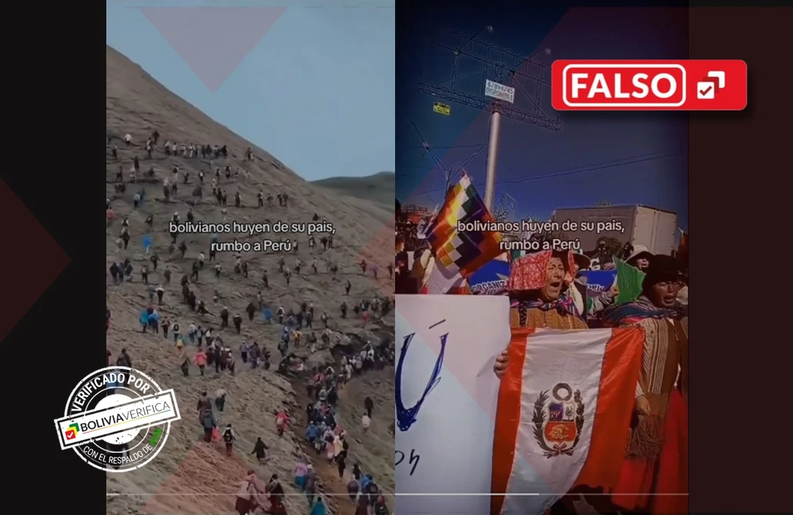 ¿Miles de bolivianos tratan de ingresar por todos los medios a suelo peruano buscando un futuro mejor?, un video compartido en TikTok difunde imágenes de personas caminando por cerros y otras marchando, para dar certeza de esta información, pero es falsa. También, menciona que la presidenta de Perú Dina Boluarte analiza construir un muro en la frontera con Bolivia, pero tampoco es verdad. Las imágenes que muestra el audiovisual están sacadas de contexto.